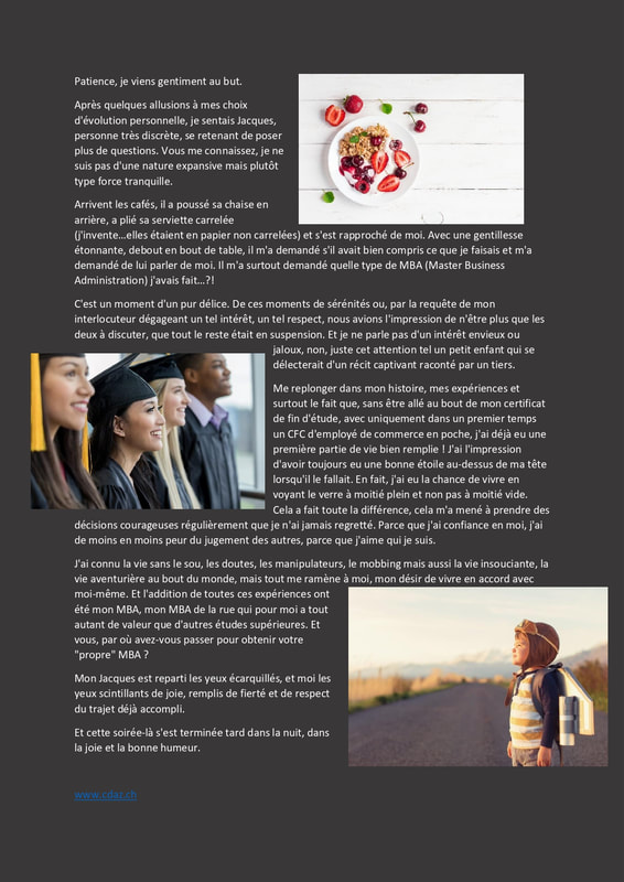 Que faites-vous de ce chemin ? S’il est vécu avec plaisir, curiosité, motivation, amour, etc., ne pourrait-il pas être un objectif en soi, celui de vivre pleinement votre chemin de vie, de renforcer la confiance en soi, l’estime de soi ? Et en cas d’échec, de maladie, d’épuisement, ces vulnérabilités qui jalonnent l’existence, de profiter pour remettre en question l’être que vous êtes et la manière d’aborder ce chemin…